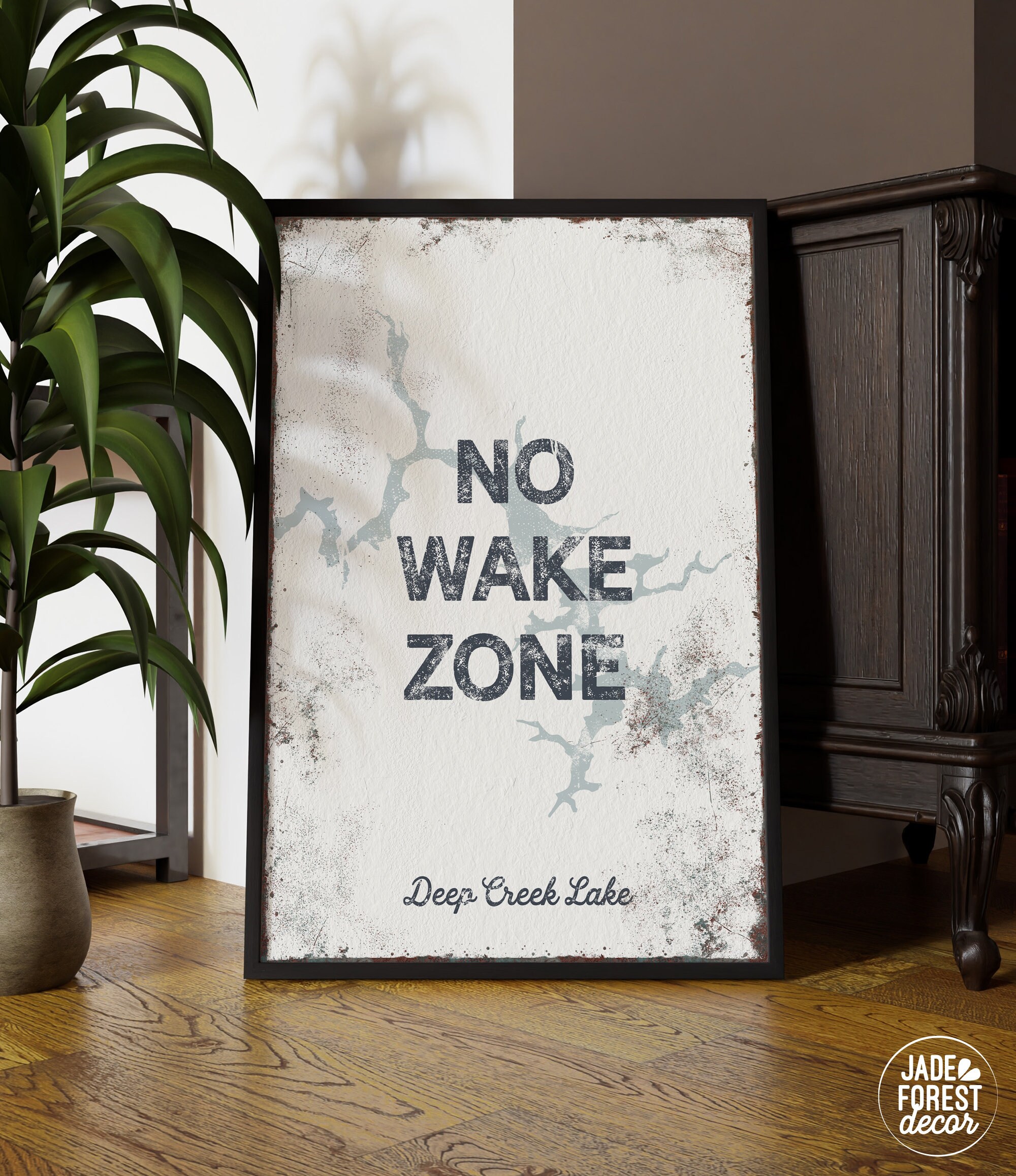 This vintage no wake zone lake house sign is designed for personalized lake decor, vacation homes, and waterfront wall art displays. Featuring vintage lettering and a distressed texture, this wall art lake print evokes the peaceful spirit of waterfront living. Personalize your piece with any lake name and choose from tide blue canvas or natural maple frame options to perfectly complement your space.