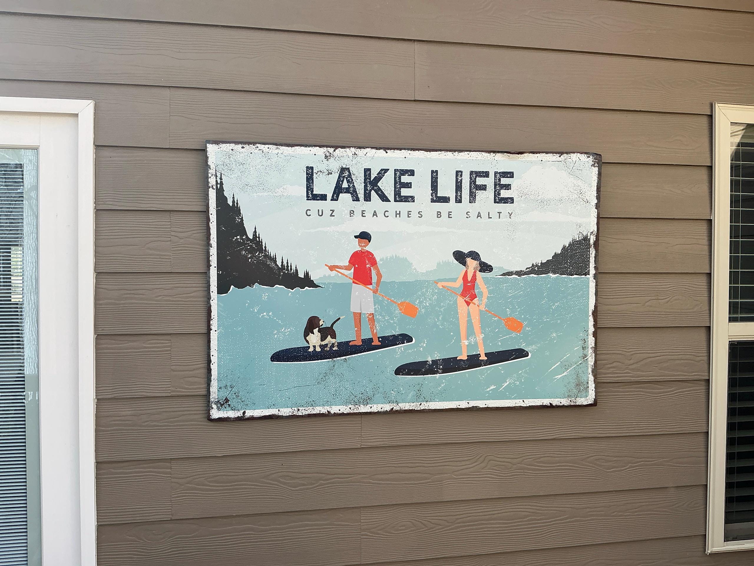 Coral LAKE LIFE Sign, Cuz Beaches Be Salty Lake Art, Couple Paddleboarding with Dog (Beagle), Can be Personalized Lake House Decor {VPL}